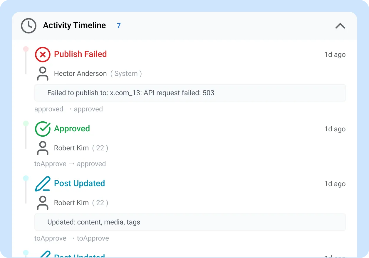 Every post has a complete history: creation, each review, every comment, all change requests, every resubmission, final approval, and publication. You can trace any post from the moment it was drafted to the moment it went live.