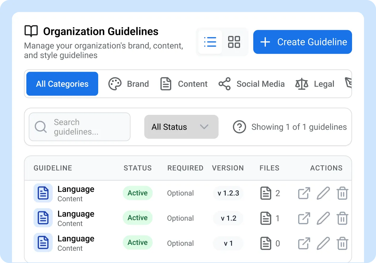 Set organization-wide brand guidelines with AI compliance checking. Guideline violations are flagged before submission and recorded in the audit trail, so your social media brand guidelines are enforced at every level.
