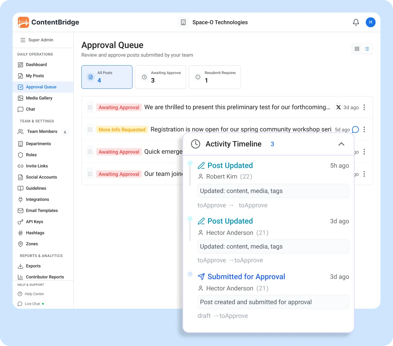 As social media audit trail software, ContentBridge logs every action on every post with a timestamp and user attribution: who created the post, who reviewed it, what comments were made, what changes were requested, who gave final approval, when it was published, and to which platforms. Edits, rejections, resubmissions, and status changes are all recorded. The trail cannot be modified or deleted by any user.