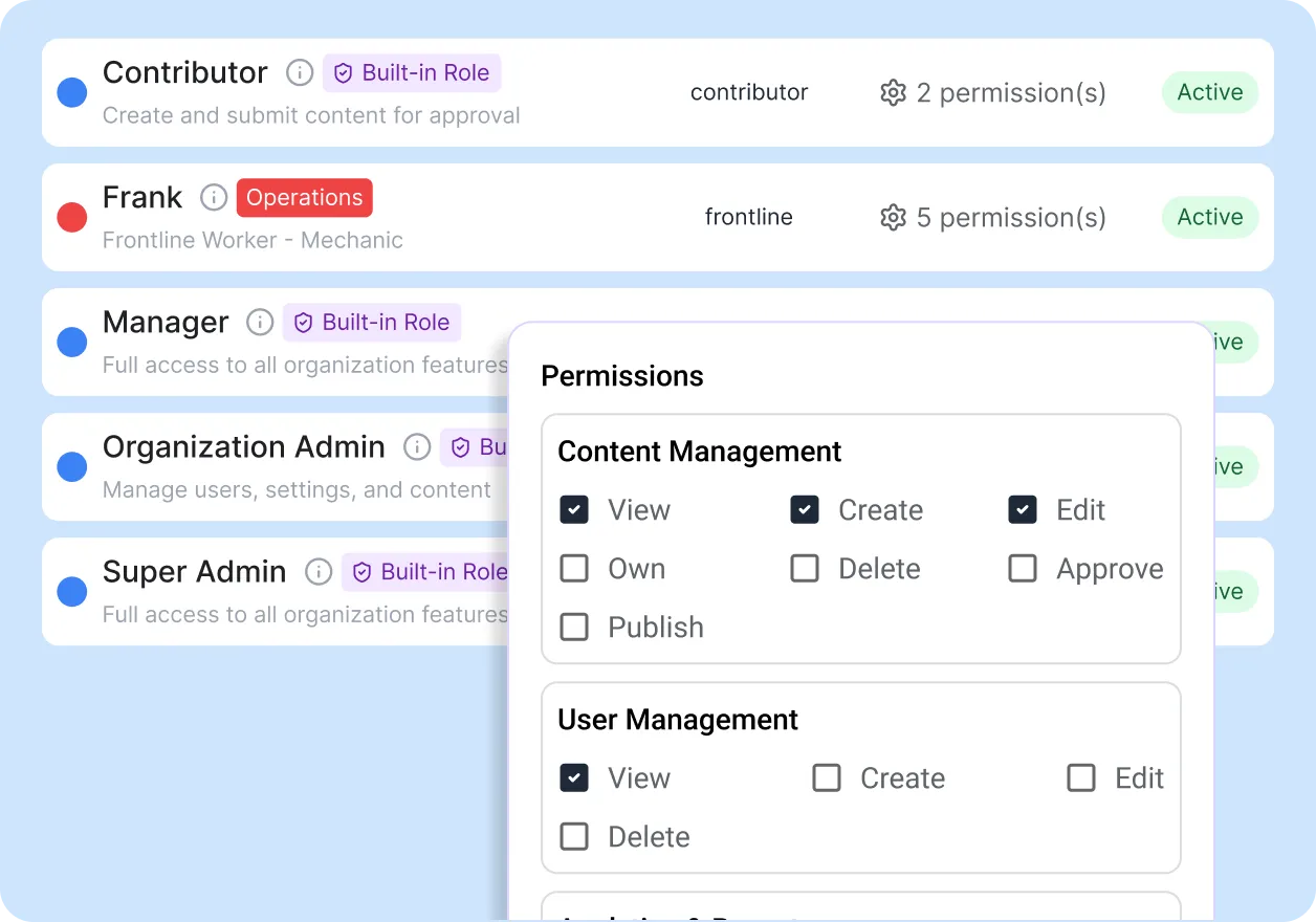 Assign granular permissions by role. Frontline creators never touch social media credentials. The audit trail records which role authorized each action.