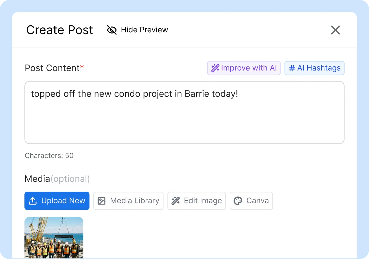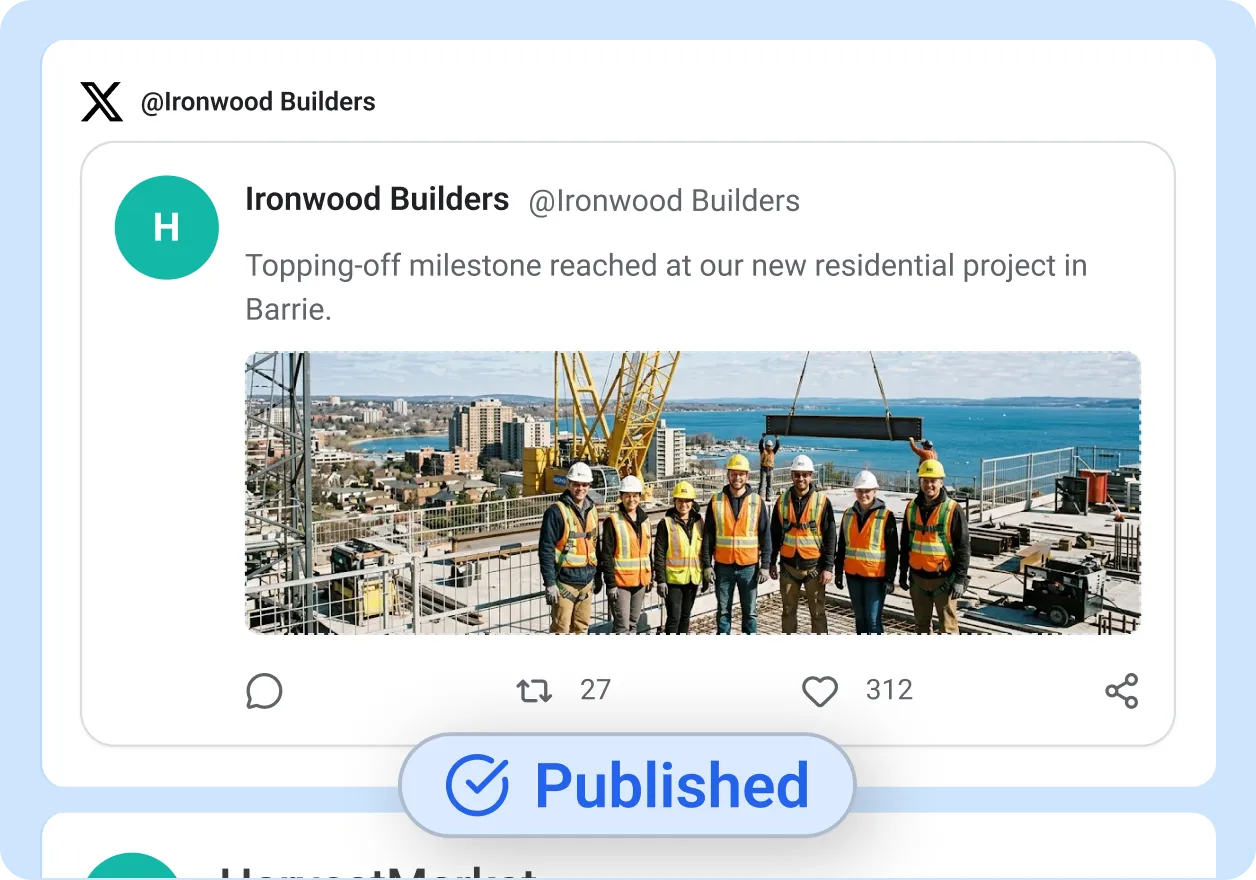 You operate 30 active projects across four provinces. Each site has different milestones, different crews, and different client requirements. A marketing team of three cannot photograph a foundation pour in Calgary and a ribbon cutting in Ottawa on the same morning. The result is silent social accounts while your competitors post daily.