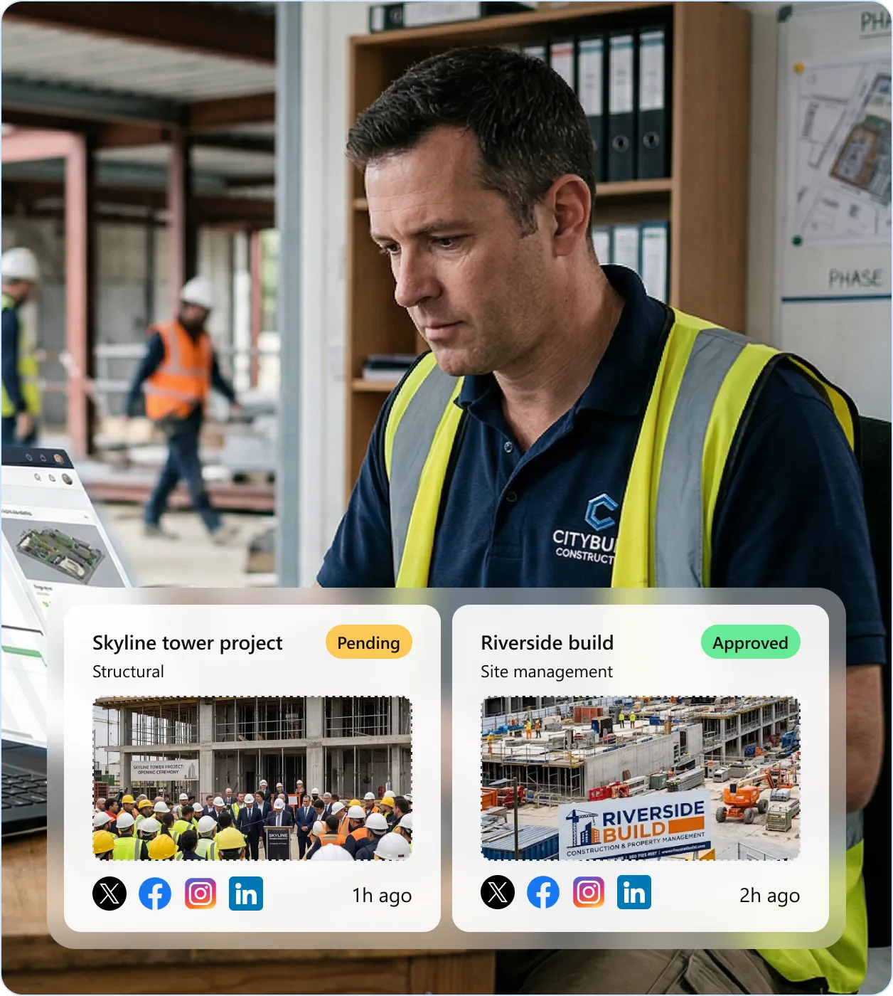 A site crew member, safety officer, or project manager photographs a milestone, safety moment, or crew achievement from their phone. They draft a post, select target platforms, and submit for review. They never see or touch your social media credentials.