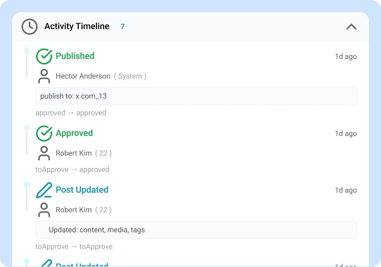 Once the final reviewer approves, ContentBridge publishes the post to your company’s official Facebook, Instagram, X, and LinkedIn accounts automatically. If the crew member scheduled the post, it queues and publishes at the selected time. The audit trail records who created, reviewed, and approved every post.