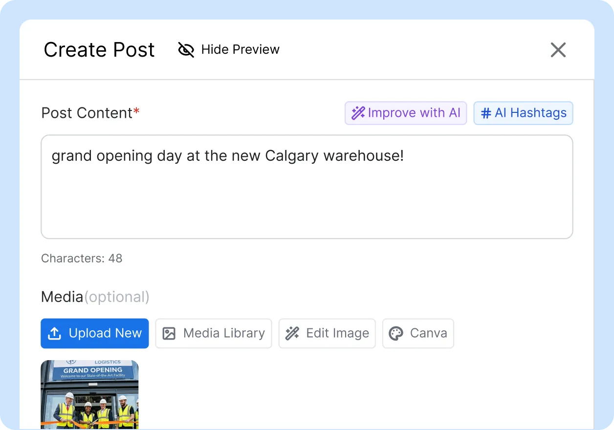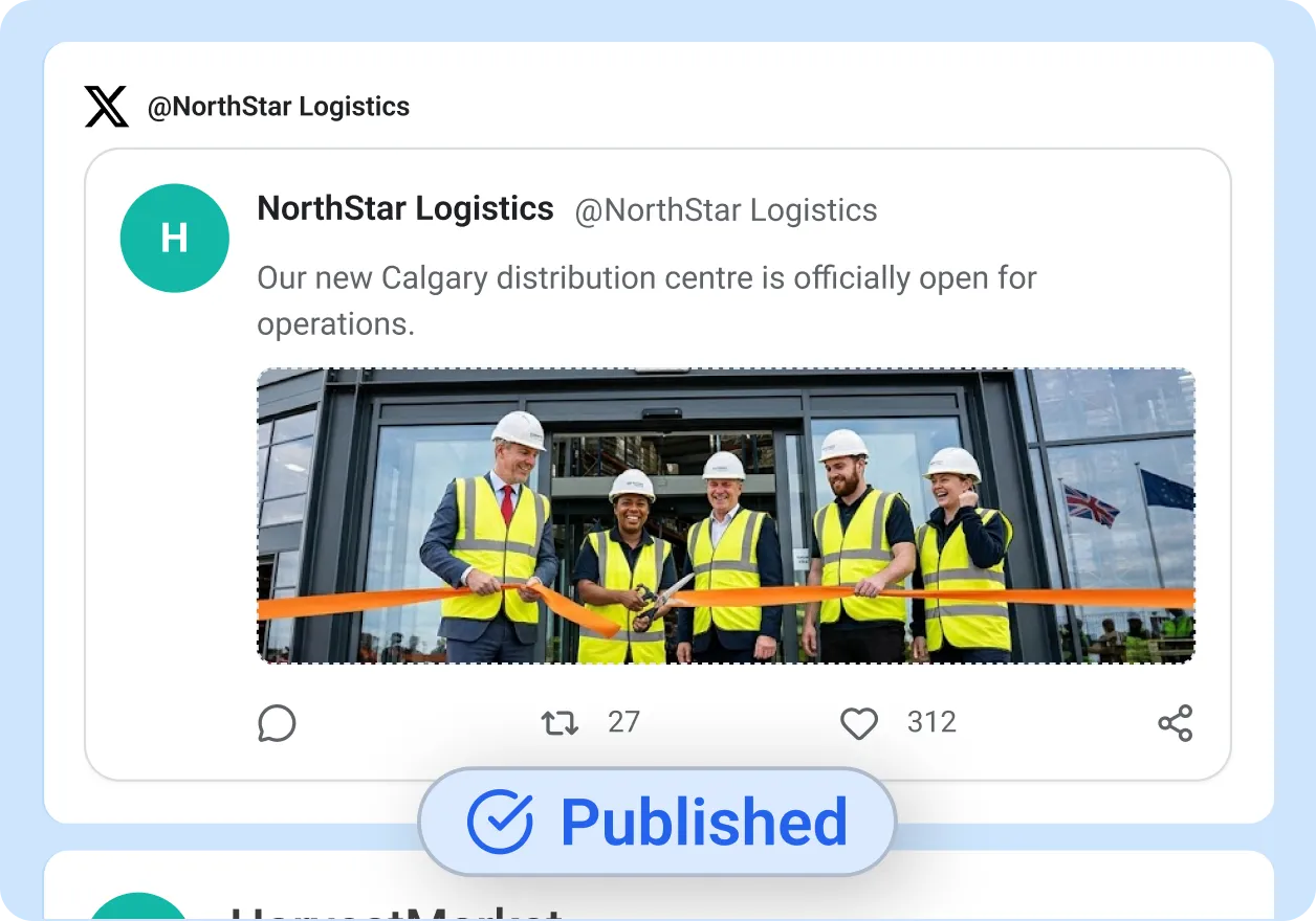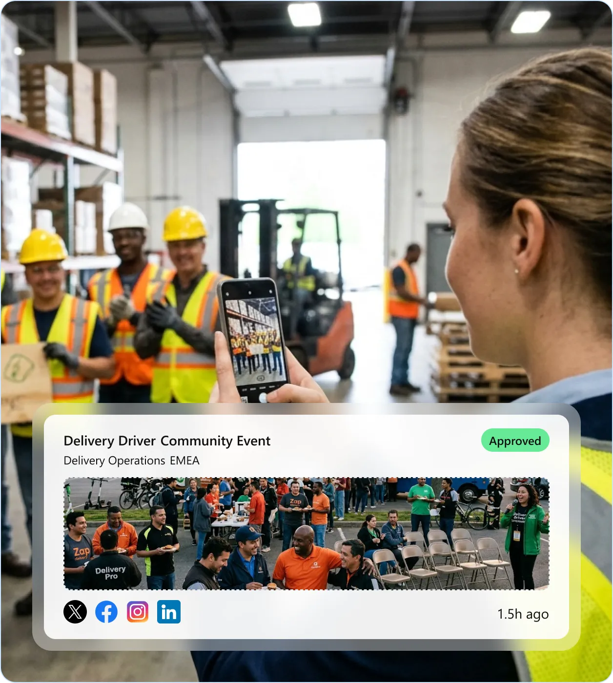 A warehouse team lead at a safety celebration, a delivery driver at a community event, or a field technician after completing a project captures a photo or video and drafts a social media post from their phone. They select target platforms, add a caption, and submit for review. They never see or touch your organization’s social media credentials.