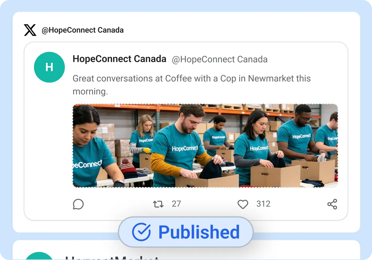 Once the final reviewer approves, ContentBridge publishes the post to your organization’s official Facebook, Instagram, X, and LinkedIn accounts automatically. The complete audit trail records every action: who created the post, who reviewed it, what changed, and when it went live. This record serves as documentation for CRA inquiries and donor accountability reports.