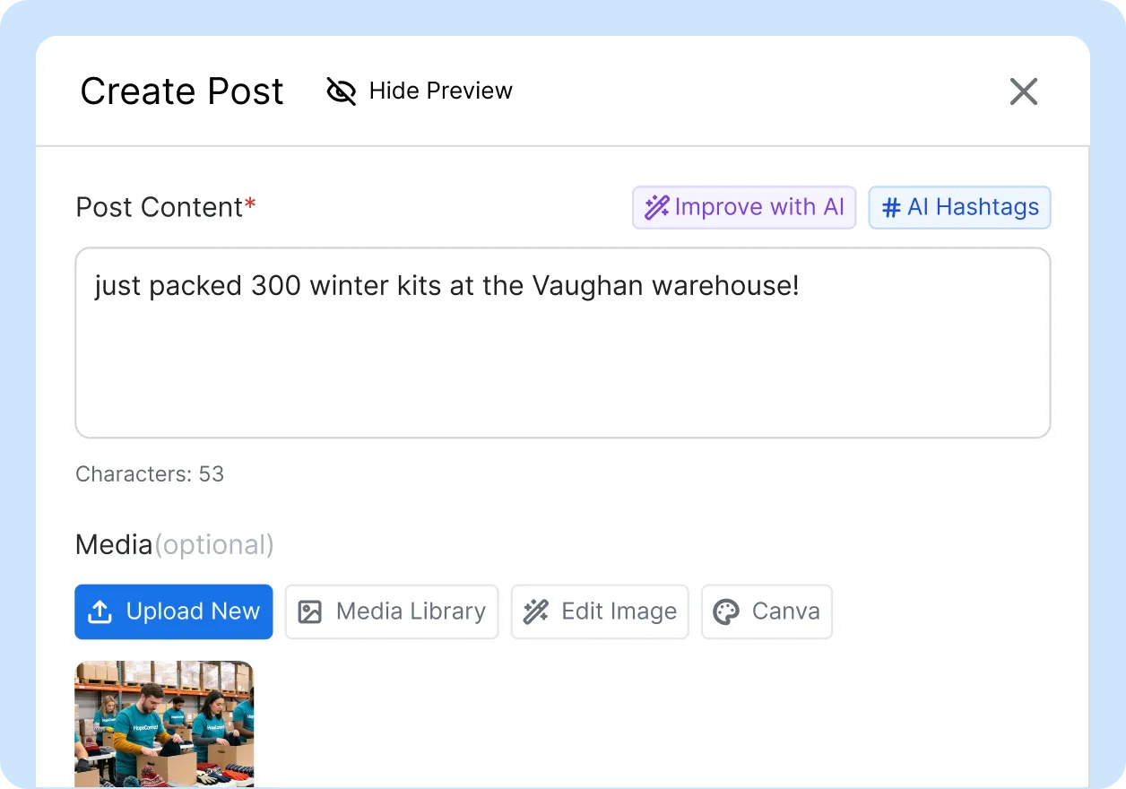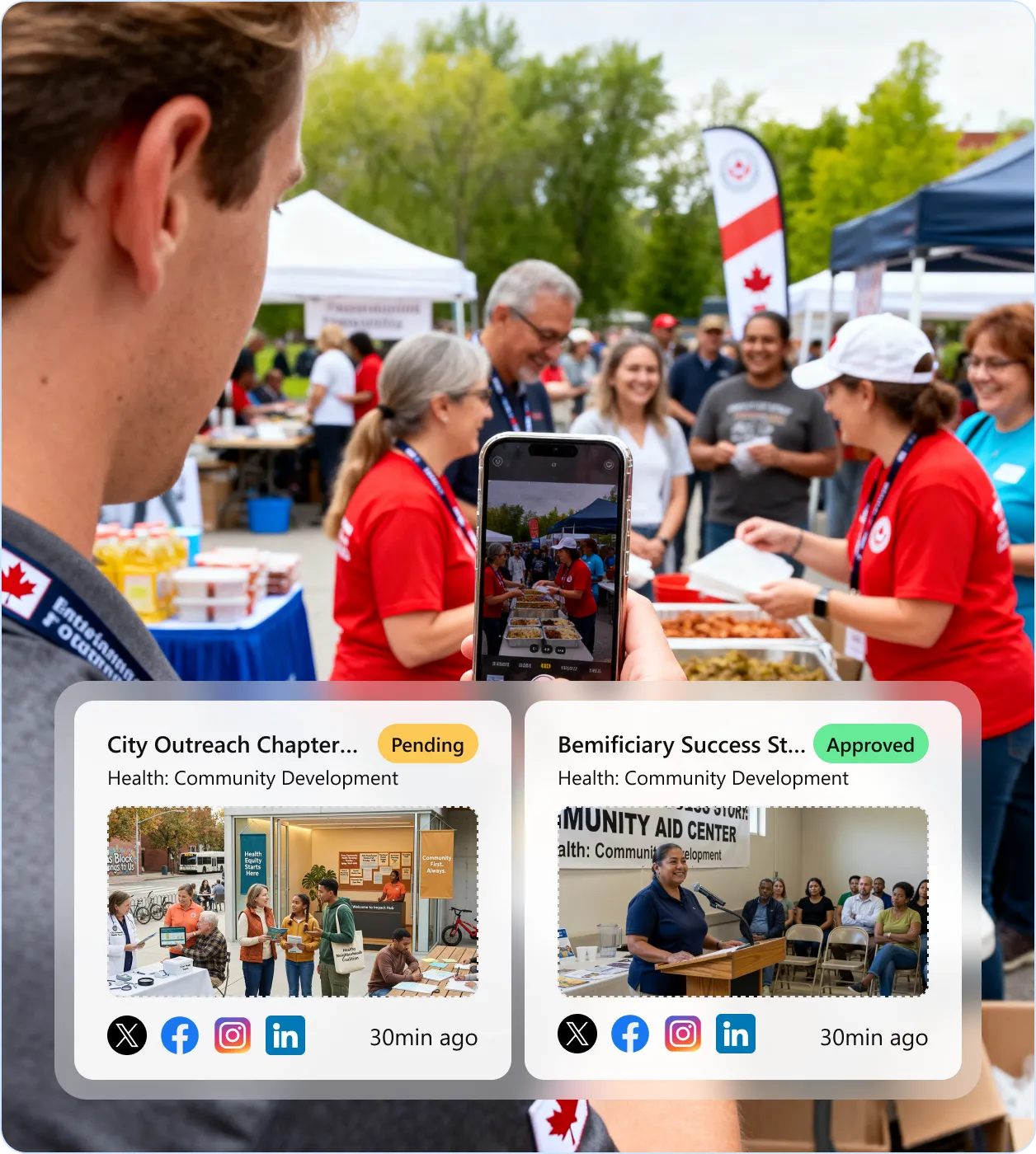 Volunteer coordinators and chapter leads document community events, fundraising drives, and local engagement across dozens of chapters. A multi-chapter charity running 200+ events per year across provinces cannot have HQ comms attend each one. AI compliance checking ensures brand voice consistency and proper hashtags before content enters the approval queue.